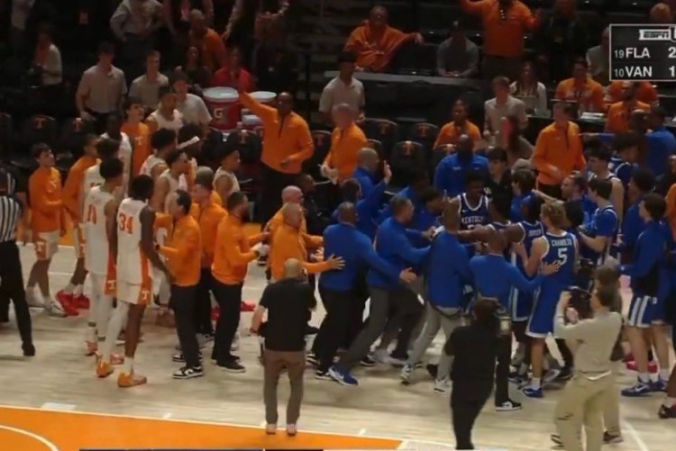 Tennessee’s Jaylen Carey shoved Kentucky guard Otega Oweh, igniting a brief confrontation that caused both benches to clear. Players from both sides rushed toward midcourt as officials and coaches sprinted in to separate them.