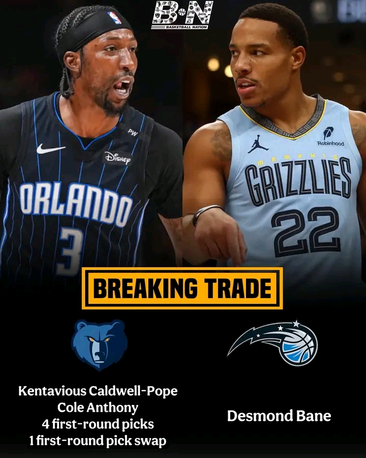MEMPHIS, TN — In a shocking and league-shifting move, the Memphis Grizzlies have traded star guard Desmond Bane to the Orlando Magic in exchange for a massive haul: Kentavious Caldwell-Pope, Cole Anthony, four unprotected first-round picks, and one first-round pick swap. The news, which broke late Monday night, sent shockwaves across the NBA and has already begun to reshape the power dynamics of the league.