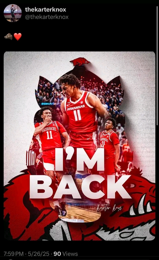 In a move that sent shockwaves through the college basketball world, standout forward Karter Knox announced his return to the Arkansas Razorbacks for the 2025–2026 season via a bold social media post featuring the words “I’M BACK” overlaid on powerful game-day imagery. The post, which quickly went viral, lit up Razorback Nation with excitement, signaling unfinished business for one of the program’s brightest stars.