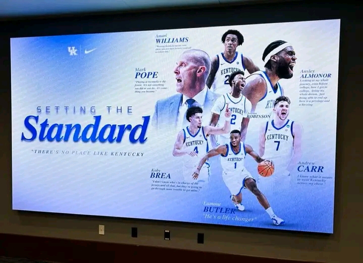 Titled “Setting the Standard,” the striking new visual installation pays tribute to the six senior leaders who helped guide Kentucky to a surprise Sweet Sixteen appearance in Pope’s inaugural season. These players—each of whom played a critical role in shaping the culture, chemistry, and resilience of the 2024–25 Wildcats—are now immortalized in a space where future greatness is built.