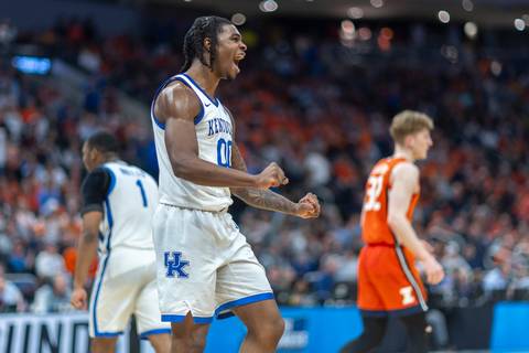 And clinging to that six-point lead, the orange-clad fans roaring, Carr made a power move at the rim, got the bucket and got fouled in the process. He made the and-one motion. He stormed over to the UK bench and slapped hands with every teammate he could reach. As he did, some of those Illinois fans started heading for the exits. The Cats would keep on dancing.